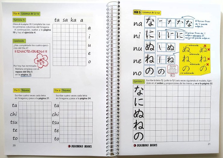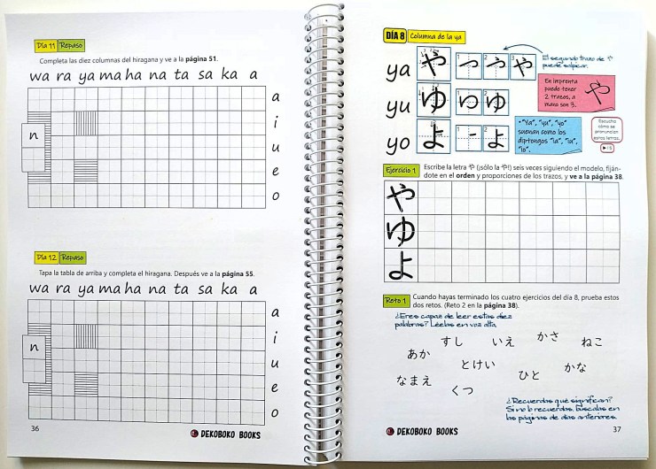 El volumen se compone de sendos cuadernos para el aprendizaje y práctica del hiragana y el katakana.