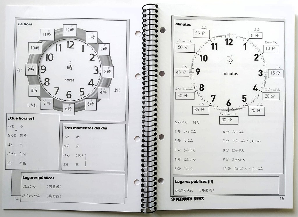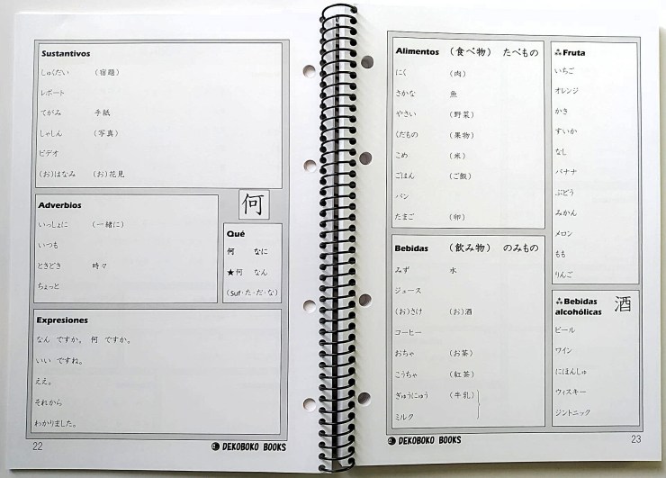 Está formado por listas de palabras: en la columna de la izquierda, en hiragana, y en la central, en kanji (cuando aparece entre paréntesis significa que los kanji no son de nivel N5, y por lo tanto no nos los preguntarán en el examen). La columna de la derecha es para la traducción, y está en blanco porque rellenarla es parte de nuestro trabajo de clase.